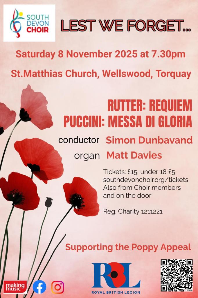Today sees the start of the Royal British Legion Poppy Appeal. South Devon Choir is proud to support the poppy appeal through our concert, ‘Lest we Forget’. Please come and join us to support the Royal British Legion and hear two well loved choral classics: John Rutter’s Requiem and Puccini’s Messa di Gloria