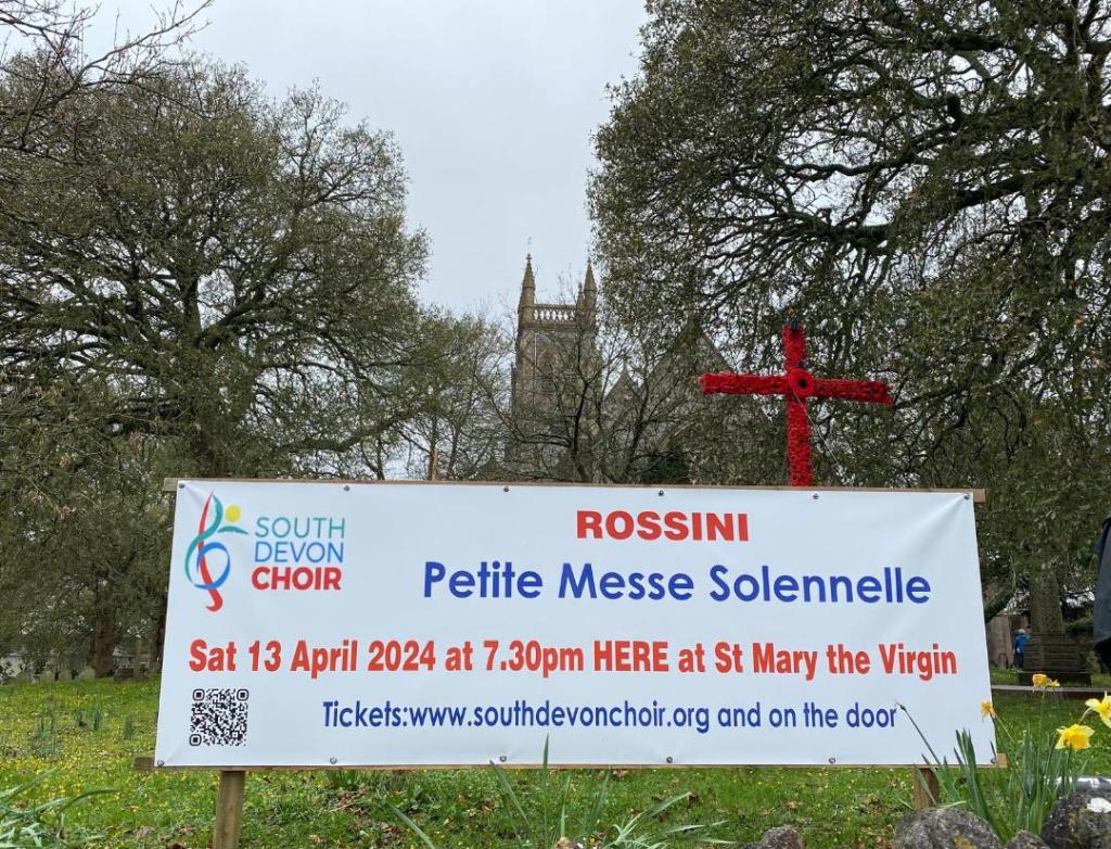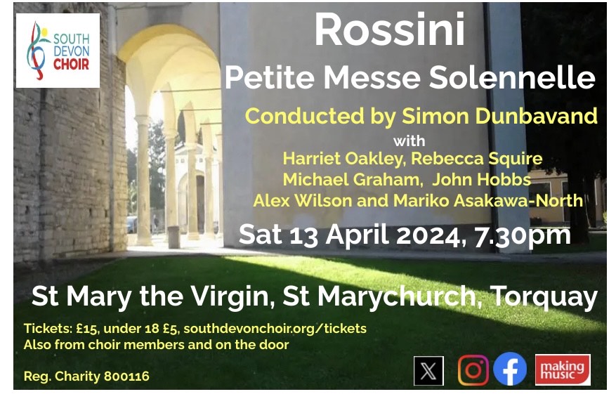 Our banner is displayed; the choir is ready; the soloists are ready, the piano duo are ready, the harmonium player is ready and Simon, our conductor, is ready. Are you ready to join us at St Mary the Virgin, St Marychurch, Torquay to enjoy Rossini’s masterpiece? Lots of interest already so please don’t leave it to the last minute to book your tickets.