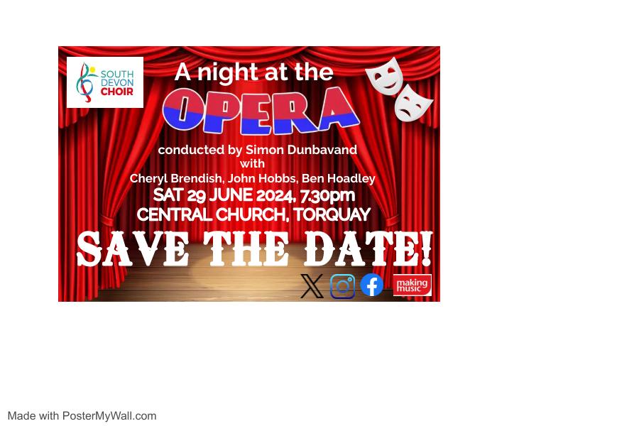 An evening of glorious, uplifting solos, duets and rousing choruses from many much loved famous operas. The South Devon Choir is joined by some of its favourite, nationally acclaimed soloists. The evening is conducted by Simon Dunbavand with accompanist Matt Davies.