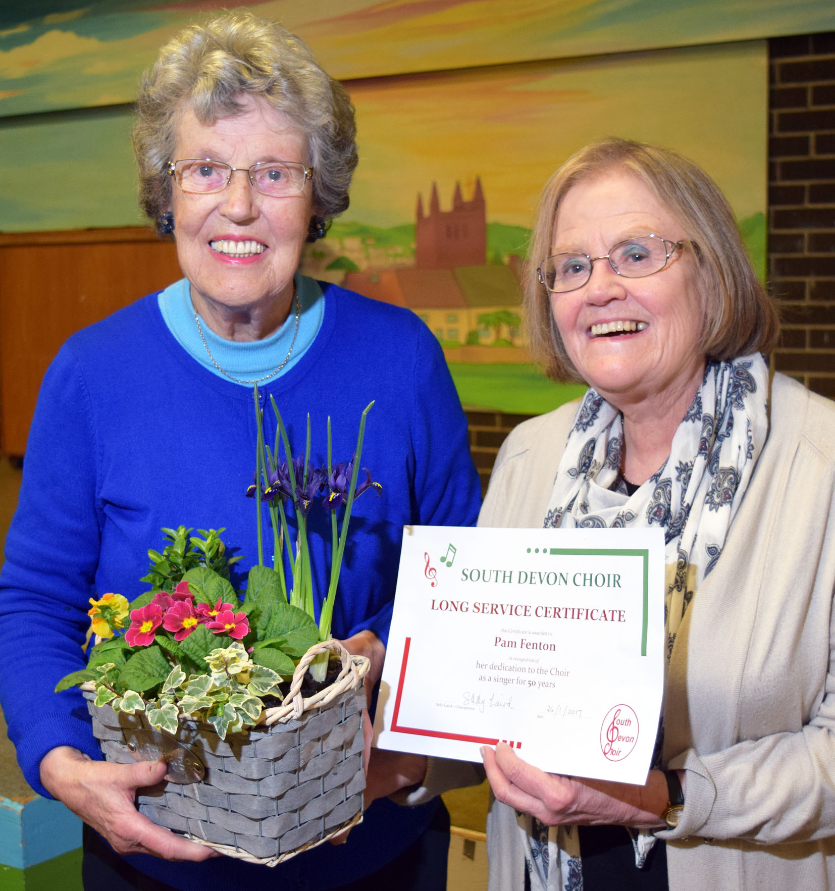 Pam Fenton was recently awarded a Long Service Certificate for her amazing 50 years of membership and singing in the South Devon Choir. Sally Laird, the Choir’s Chairperson, presented Pam her Certificate and a basket of spring flowers at the AGM in January 2017. Even though it seems a bit of an effort to turn out in the wind, rain, snow and fog on a winter’s evening to attend rehearsals the effort is always rewarded with a feeling of well being after singing and meeting old friends. Well done Pam, we applaud you.